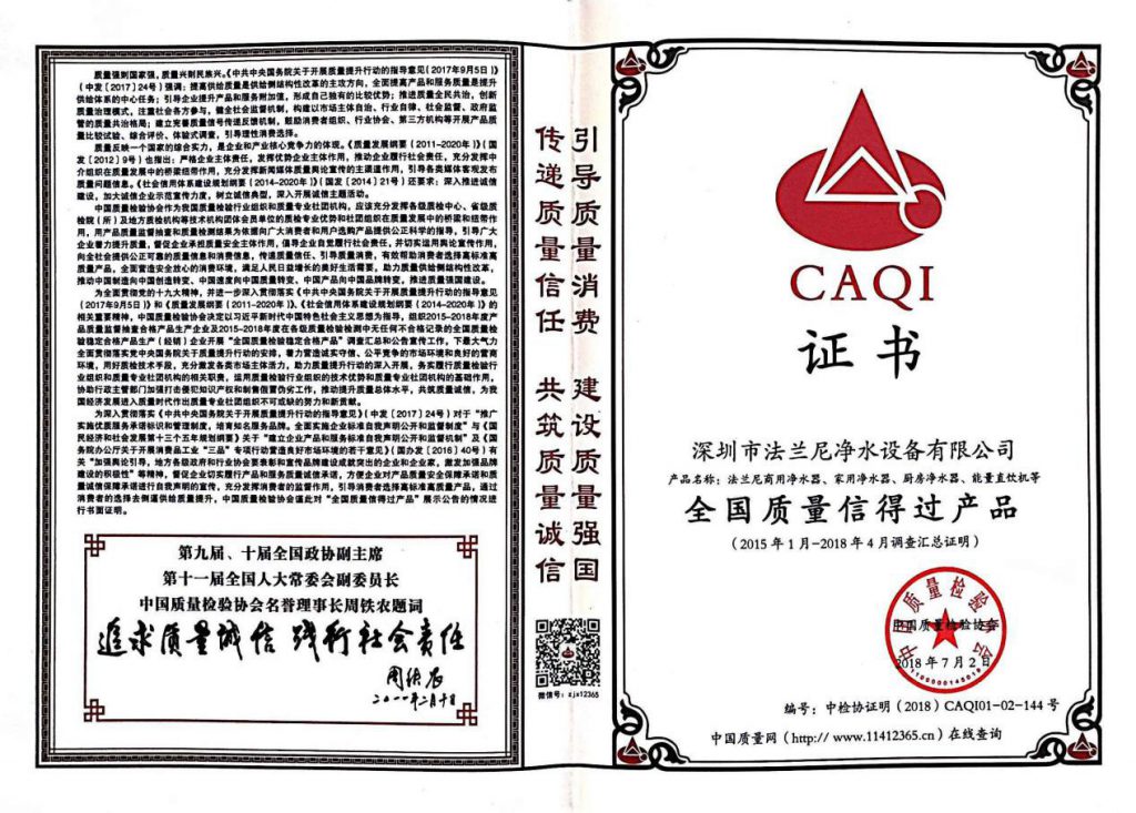 质量是企业的生命,只有高标准才有高质量。俗话说,“没有规矩,不成方圆”,标准就是指产品的“规矩”。平常我们说一个产品合格不合格,所谓“格”就是指“标准”,符合标准要求的称为合格,反之不合格。企业所生产的产品质量最终是由标准和执行标准的状况决定的,标准化是质量保证的一个关键。比如法兰尼企业的净水器产品,要有质量管理的高要求,有产品采用标准的先进性,更重要的还是执行过程的高标准。法兰尼以高质量的产品参与市场竞争,而且严格执行国家行政性、强制性标准,积极采用国际标准和国外先进标准,并且执行标准、落实标准。