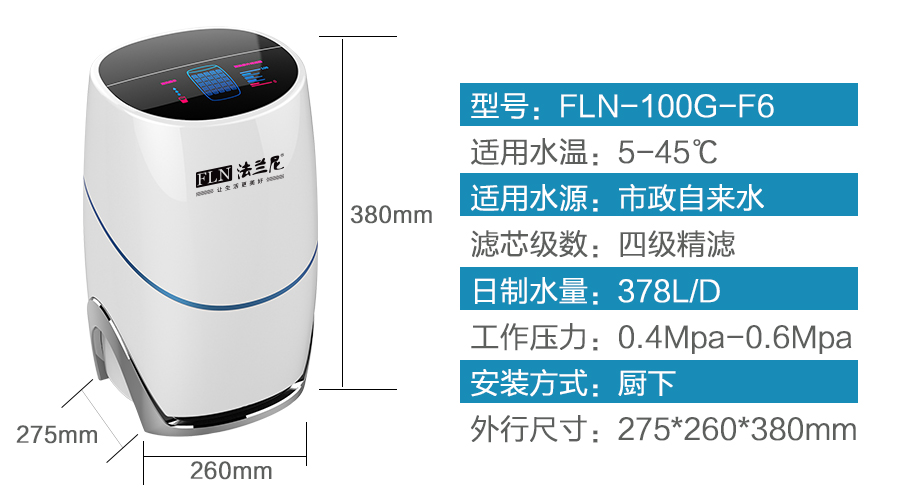 法兰尼FLN-100G-F6采用高品质精密RO膜分离技术,有效净化水质,滤除水垢、细菌、病毒及重金属等危害人体健康的水质,出水纯净,能够放心饮用。