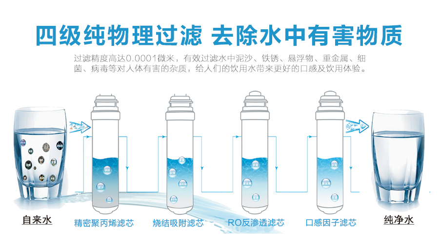 第四级:口感因子滤芯,去除余氯、异味,提高谁的口感,防止二次污染。