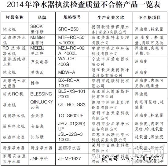 目前,检查结果已经全部出炉,从结果来看,有13家企业的产品不符合QB/T4143-2010《家用和类似用途反渗透净水机》、QB/T4144-2010《家用和类似用途超滤净水机》标准规定的产品质量要求,其中主要的不合格项目包括浑浊度、耗氧量、肉眼可见物、铅等。目前,质检总局已责成有关地方质检部门对上述企业依法进行查处。